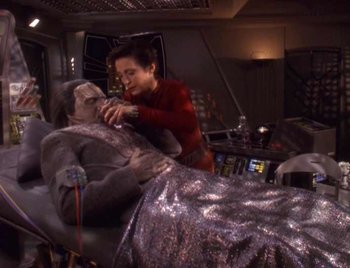 Review: A sequel to “Second Skin”, but unlike that one fails miserably to evoke any intrigue or emotion. Again I think a huge part of the problem is Visitor just over emotes when she’s angry, happy, or sad. The script doesn’t do her any favors, though. I understand why she cares about Ghemor, but she treats him like he’s her actual father, and she didn’t even spend that much time with him. Additionally, the flashbacks with her real father are cliché (“Don’t go Nerys” “I’ll be right back father!” “Oh, he died while I left!”).