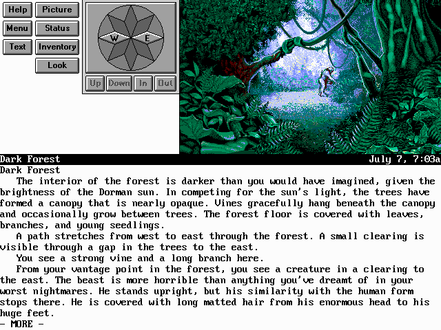 The game design is identical to all the early Legend games, with the option of playing the game as a straight text adventure or using a graphical point and click interface reminiscent of the frame hell of Geocities websites and requiring the user to choose from a list of every possible verb the game understands rather than the standard eight from LucasArts games of the time. While I can’t imagine any sane person strictly using the mouse to play Gateway, the verb list is occasionally helpful for reference and the still pictures are helpful in visualizing puzzles in addition to being gorgeous. I played with the graphics on but the verb list off.
