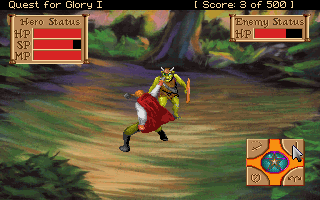 When I played Hero’s Quest, oh, about twenty years ago, I decided to play a straight fighter. This was probably the wrong choice for a first-time player. While the puzzles are generally more straightforward (almost all of them require brute strength or good guy politics), fighters require more grinding to build their stats and earn money for equipment and potions. And as fighting is the clunkiest and least satisfying part of the adventure (in both versions), it’s no wonder I was lukewarm about the game.