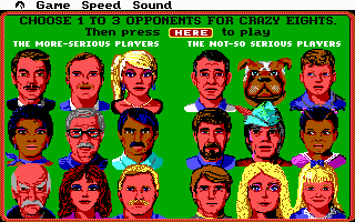 Six games are included: Crazy Eights, Old Maid, Hearts, Gin Rummy, Cribbage, and Klondike. I was nine years old when we got this and I was already bored by Old Maid, but I love Gin Rummy and Cribbage. Every offering here is solidly implemented and user-friendly. What makes this stand out from other computer card games is that there are 18 opponents to choose from of various difficulty and personality. Some of the players are characters from Sierra Games (e.g. Sonny Bonds, King Graham, Larry Laffer, etc.), some are designers at Sierra, and there’s a dog! These characters will banter with you or each other while playing, though this was not as entertaining as it could have been.