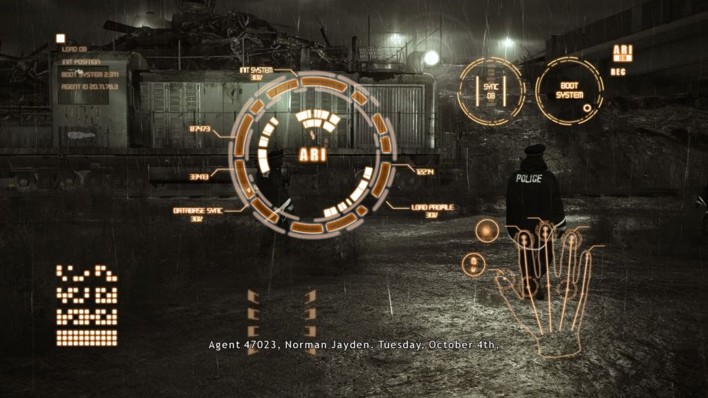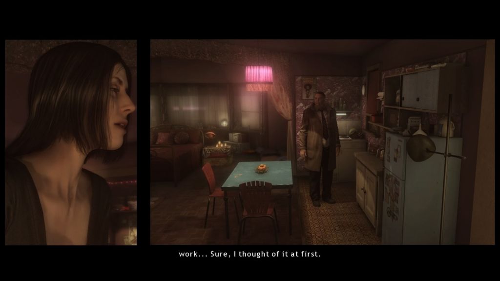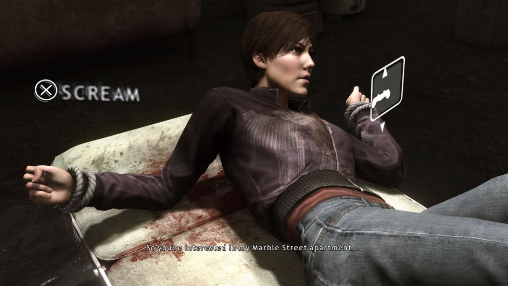 Gameplay is similar to Fahrenheit. There are few puzzles, just conversations and quick time events to advance the story, with decisions you make affecting the story’s outcome. Conversations are multiple choice; sometimes the choice is a direct response, and sometimes the choice is an approach (e.g. aggressive, patient, empathetic). And each choice is time limited (2-5 seconds) so as to keep the pace. If you don’t make a choice, generally the most passive option is the one you will see occur. In Fahrenheit, the quick time events were akin to the children’s game Simon. Here, they are simply following joystick and button patterns. Blissfully, the difficulty level can be adjusted to fit your hand-eye coordination skill, and there is no punishment or change of story if you choose an easier skill level. I went with moderate difficulty and was able to do what I wanted in most scenes without having to replay them.