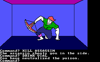 To no surprise the parser can’t compete with Infocom’s at the time, but man oh man there are almost no synonyms implemented. There will be several times you are on the right track but you can’t guess the correct verb. Sometimes “use” is the correct choice while most of the time its more specific. Also frustrating is the inability to just look at the room you’re in; if you want to read the sparse description you need to exit and come back (which is not always possible).