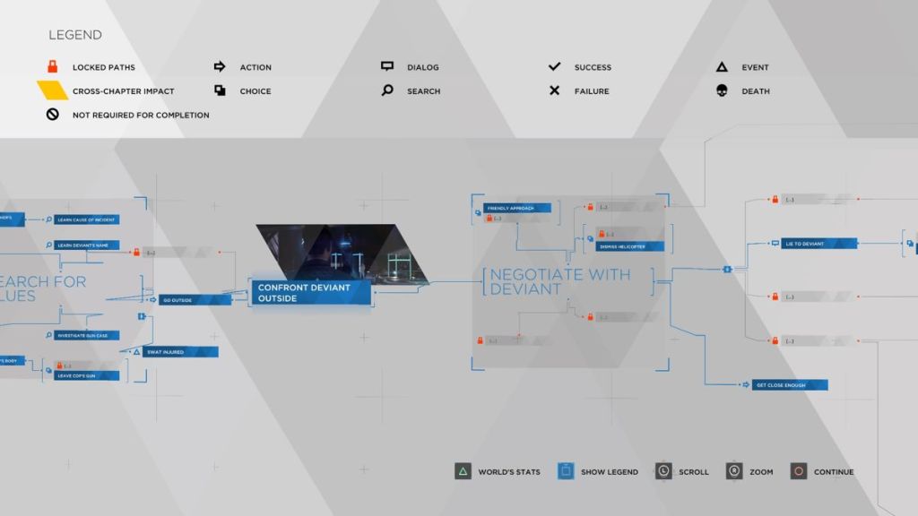 The hostage scenario can end in one of six different ways depending on how well you negotiate as Connor. While none of the resolutions significantly impact the course of the game, things definitely change based on your actions. Heavy Rain was similar, only it was difficult to tell which scenes had alternate paths. Detroit eliminates that problem by creating a flow chart of every scene so you can tell what other possible branches exist (without revealing how to access them). Not only that, you get to see how your choices stack up against every player in the world. For example, on my first playthrough I saved the girl in the hostage situation and noticed that of the six possible endings, the one I reached was the most common.