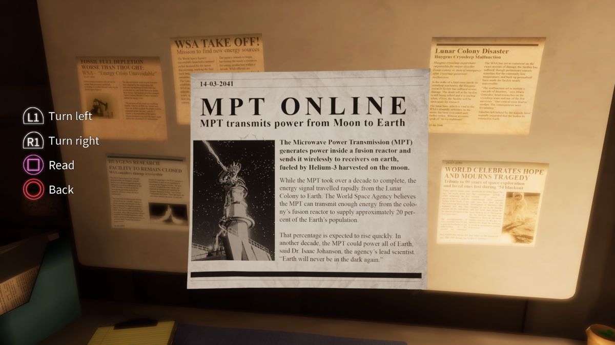 In the very near future, Earth has gone to shit due to climate change and is only barely hanging on due to an incredible mining operation on the moon that delivers Helium-3 to Earth, providing much needed energy to the people. Helium-3 is a real isotope, is indeed on the moon, and has been speculated to be a possible energy source. The rest here is science fiction and is all explained in the opening narration. Unfortunately, the station and mining operation have gone dead, and for five years the Earth has been rapidly becoming uninhabitable. You, Claire Johanson, are being sent on a rogue solo expedition to the station to find out what went wrong and hopefully get that sweet, sweet Helium-3 pouring in again.