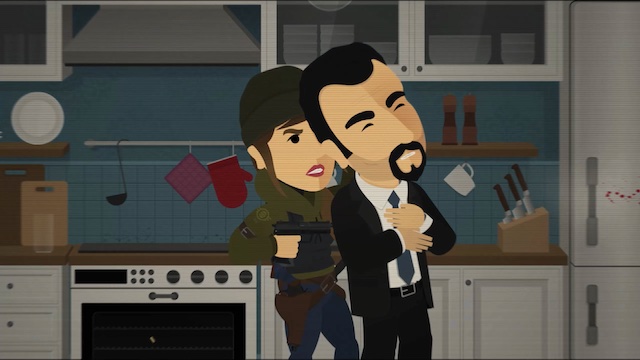 The animation style is clearly inspired by South Park, with two-dimensional cartoony characters sporting oversized heads and moving around in a stilted manner. The background graphics are colorful and easy to discern but quite low in detail. Lest that sound like a criticism, I was often charmed by the simplicity and it helps make all the carnage more palatable. The home of American agent Matilda is realized in a modern but bleak and gritty style, with street robot security guards and apartments armed with turret guns to punish minor infractions. Meanwhile, the Russian colonial fort of Shambletown replete with parapets, a castle, and street markets is drawn in softer tones. My only minor graphical complaint is a glitch I encountered several times in my second playthrough, where miniature non-interactive copies of various characters were randomly spread throughout a scene.
