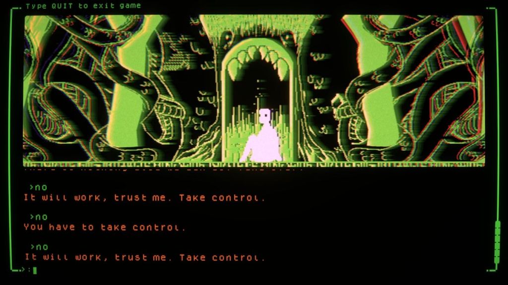 And then just when it seems like you’re getting somewhere, the game ends with you wondering what on god’s green screen just happened. I played through the game three times, finding two endings, but I honestly have no idea what I did to trigger the second one. And as I barely felt closer to understanding the big picture, I did not feel compelled to continue trying, especially since you must start from the beginning each time. On a couple of occasions the game froze on me, but thankfully upon restart I came back to where I was. On one playthrough, however, the game didn’t accept a necessary command to continue for no apparent reason, requiring me to start over.
