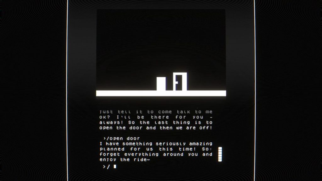 You are still reading. Great! So what is this game about, you wonder. At first it’s unclear, as you simply guide the cipher through a series of very basic adventure puzzles in an attempt to go through a door. A door that is nestled in a wooded area replete with a jukebox, public shower, and a vending machine—the types of incongruent items one was likely to find in early text adventures. If you want the rest to be a surprise (as it was for me), then skip ahead. All you need to know is that once you attempt to go through the door, the game turns the entire genre on its head, spins it around, and kicks it a few times for good measure.