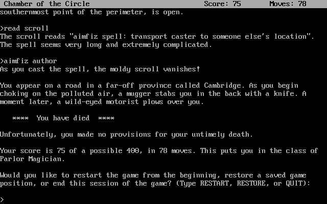 Sorcerer rewards the player in many other ways as well. While there are many red herrings, when you attempt to solve puzzles in logical ways and fail you are almost always rewarded with an amusing retort as to why it didn’t work. The side effect of this was that I trusted the game to communicate well and I never went to a walkthrough when I was stuck. In fact, to this point it’s the first Infocom game where I didn’t require at least one hint (outside of A Mind Forever Voyaging, which is generally puzzleless).
