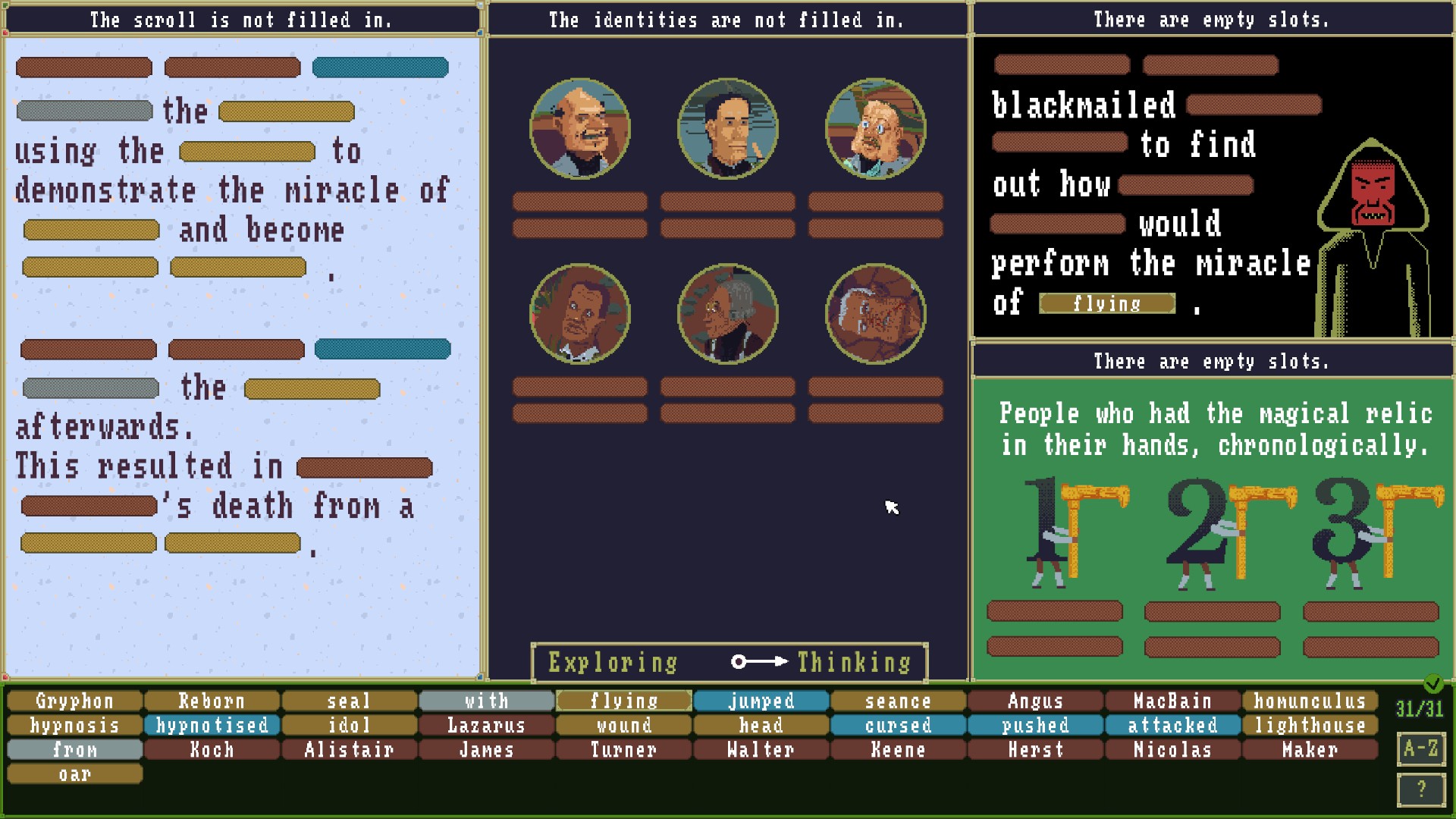 The game begins with a static moment in time (in the 18th century), that of one Englishman pushing another off the edge of a cliff. Investigation is done simply by clicking on characters and evidence to gather key words. For example, one of them has a letter on their person describing who gets what percentage of the valuables they discovered on their expedition. You can pull the names Albert Cloudsley and Oberon Geller into a word bank. Looking through their pockets and belonging lying about, you can also pull other words such as ‘finger’ ‘thumb’ and ‘ruins.’ While some of these words can be difficult to find, you can turn on a hotspot highlighter that will remedy the problem. Once you’ve collected all the words for the bank (in this case 11 of them), you must fill out a report describing the whos, wheres, whys, and hows of the murder. In some cases, sentences will be partially written Mad Libs style and you simply need to drag the right word into the blank space.