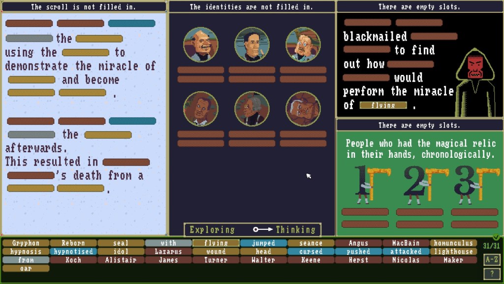 Each report you fill out will be divided into sections. One often is pictures of each character with spots to identify their first and last names. Another might be a paragraph outlining the motive. And another might be describing how the murder occurred. In each section, you will be notified if you have two or fewer spaces completed incorrectly, a blessing if you’re on the right track but are just confused on one detail. Some words from the bank can be used multiple times, and some may be just red herrings.
