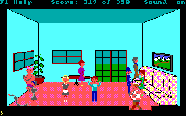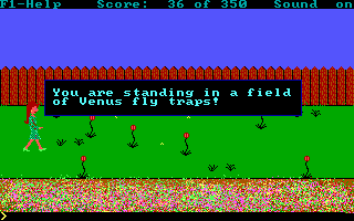 There are two puzzles that require pin-point precision to avoid instant death/failure. Remember the obnoxious winding mountain path in King’s Quest III? Yeah, that’s a walk in the park. On one screen, Penelope can be killed–literally KILLED–by Venus flytraps. The only solution is to maneuver around them, but the hit detection is pure guesswork. Since the flytraps do not exist in a three-dimensional environment, anytime your feet get within three our four pixels of any part of a flower, it’s permanent bedtime for Penelope. Later on, you must cross a tiny bridge without dropping your matches in the creek. Again, the bridge, while appearing three-dimensional on the screen, acts two-dimensionally and figuring out the correct path across is nigh impossible. To add insult to injury, if you try to throw the matches across the creek, the game mocks your idea as too risky.