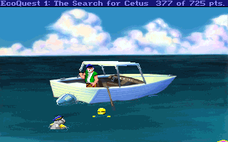 Most of the game takes place below water with Adam sporting the world’s longest lasting oxygen-tank. He will visit the underwater city of Eluria, gain their trust by helping undo damage done by humans, and then search for Cetus. Play uses the familiar Sierra icon system, with one extra icon added that asks Adam to deposit garbage into his trusty sack. Doing so is rarely necessary, but the game rewards you with points as well as a pat on the back.