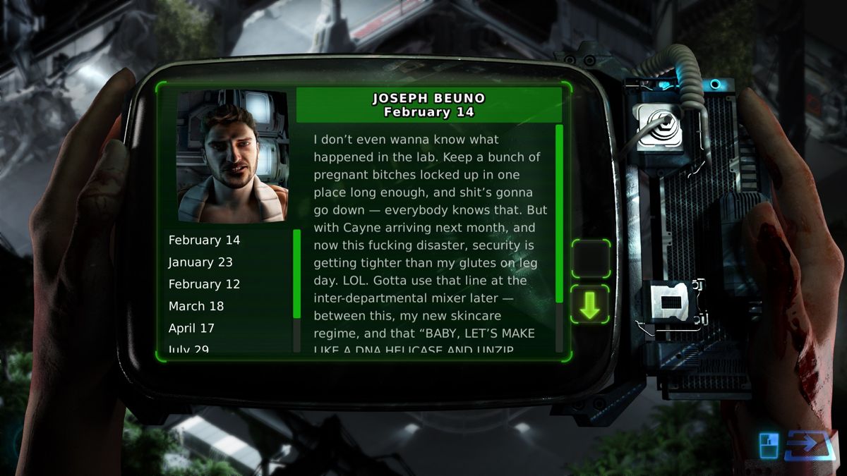 The puzzles themselves generally involve a lot of locked doors on the ship in addition to combining inventory items. Some of them are entertaining to solve and often require you to glean information from crew member histories. As in Stasis, everyone’s PDAs are just lying about, undamaged, for you to read. While they bring a lot of (gross) flavor, the history of the ship and the reason Hadley is there remains a bit too vague for my tastes.