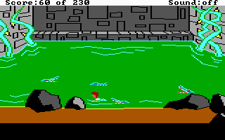 Given the simplified interface for children, it’s surprising then that its so incredibly easy to die in the most obnoxious ways possible. They put in a thirst and hunger daemon, something Sierra, despite all their faults, generally didn’t do. Running out of water for your flask is a bit difficult to do given the abundance of fresh water around, but it happened to me once when I was in the Horned King’s castle, where there is no water to be found and I wasn’t adequately prepared. It is very easy to die of hunger as you’re given limited food; there is a bottomless food wallet you can find, but only entirely by luck as its location is not logical and not signposted.