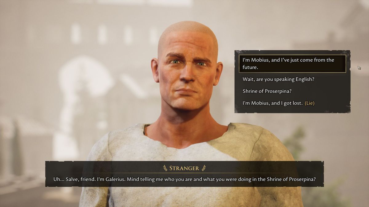 While in the ruins, you come upon a portal that transports you back in time to Ancient Rome and a fictional city. A friendly man named Galerius greets you as you exit the portal. He brings you to the magistrate, Sentius, who explains the city’s (very short) history. This place was created by the Gods in hopes of a perfect society, where the Golden Rule is strictly enforced. Should anyone break the rule (of which the exact parameters are not clearly known), the golden statues around town will come to life and swiftly kill everyone. Thus, the idea is, everyone will be an upstanding citizen.
