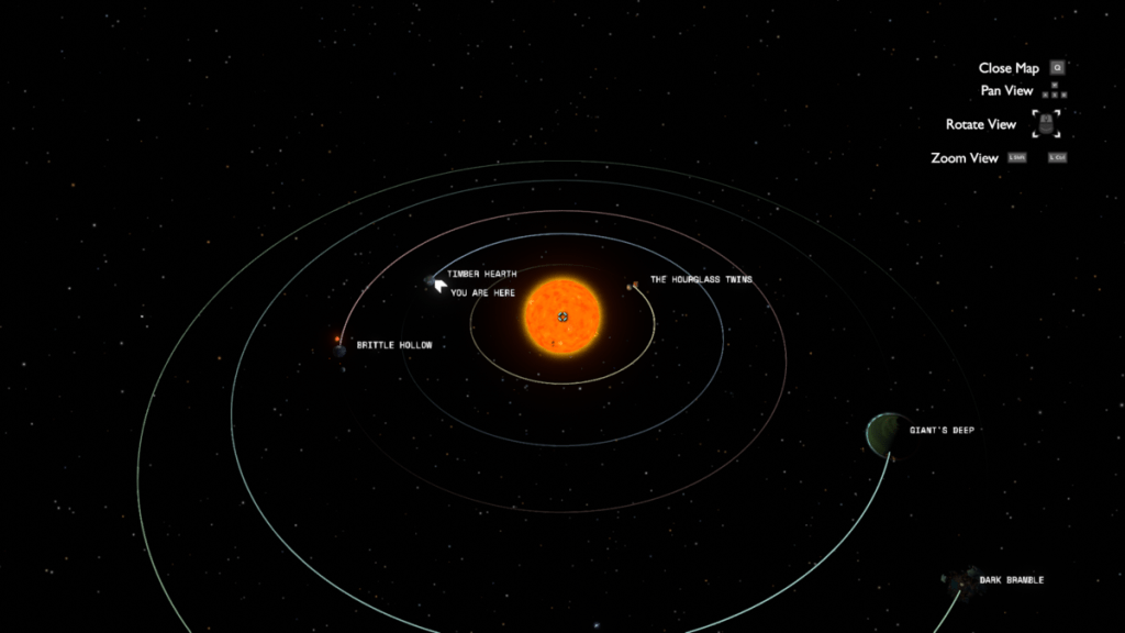 You play the nameless protagonist (from a blue, four-eyed humanoid race) on the planet Hearth, a brand new cadet joining a team of five explorers in your village’s relatively new space program. Three of your colleagues are hanging out on other planets in the solar system, and one is missing. In addition to grabbing the launch codes, exploring your village helps you learn the ropes of everything you will be doing in space. There’s a cave where you can practice moving around in a zero-G environment, including doing ship repair. You can play with a model spaceship to get used to the controls. You can practice using a scout device you will need regularly on your travels. But most importantly, you should check out the space museum to learn about the extinct Nomai race.