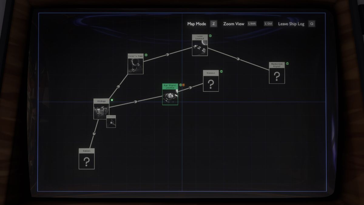 Yeah, exactly 22 minutes after you wake up, the sun goes supernova, destroying the entire galaxy. You then are hurtled back in time to the campsite, waking up to once again see something explode over the green giant. You’re the only one who realizes time has restarted, and everything you’ve done has reset itself. The one exception is the game’s saving grace; on board your ship you have a computer that keeps track of information you’ve learned through each loop. This information is sorted into two places; you can either look at all the info you’ve gathered planet by planet or in a flow chart the game creates to link different puzzles to each other. While taking your own notes can be helpful in remembering certain details, the computer keeps track of everything super important. Not only that, when your computer updates with information you’ve gathered, there’s a rush of satisfaction seeing the chart get filled out.
