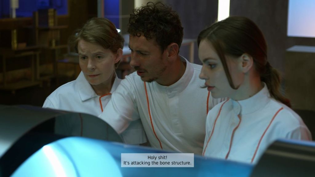 It’s a shame, too, as the sets and cinematography are above average for this type of game. While it’s clearly low-budget, it did feel like I was inside a high-tech facility complex with futuristic touch screens and quarantine pods. The directing is competent, if uninspiring. Due to the nature of the game, it’s usually obvious when a scene you’re watching based on a decision transitions to a scene universal to all playthroughs, and the cuts in conversation are occasionally awkward.