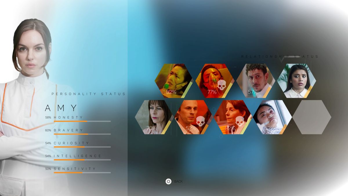 While it’s nice to see the immediate impact of your decisions, the system is a bit wonky. While the direction your relationships move always make sense, the percentages seem random. There appears no way to move your relationship with someone to 100 percent or 0 percent, even though your actions can directly save people’s lives or kill them. Indeed, the only thing that matters as far as plot branches go is whether you’re over 50% or below it. Several other relationships are tracked as well, but they never change the course of events and only matter for a couple of achievements. And, annoyingly, a couple of the relationship percentages are hard to read as they’re displayed in a white font on a light background.