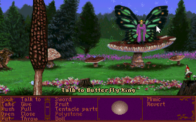 The world is bright, sharply detailed, and the rotoscoping animation is phenomenal for the time. Whether it’s pulling out your sword, throwing a rat, or climbing a mountain, it all feels smooth and well-realized. The locations are also generally fresh and interesting, from the shapeshifter forest where most of the rocks and trees have various visible body parts, to the crown in the faerie forest that is guarded by several of the most enormous toads you’ve ever seen. Several panoramic shots are also used during cut scenes. The MIDI music is also pleasing to listen to, if not memorable.