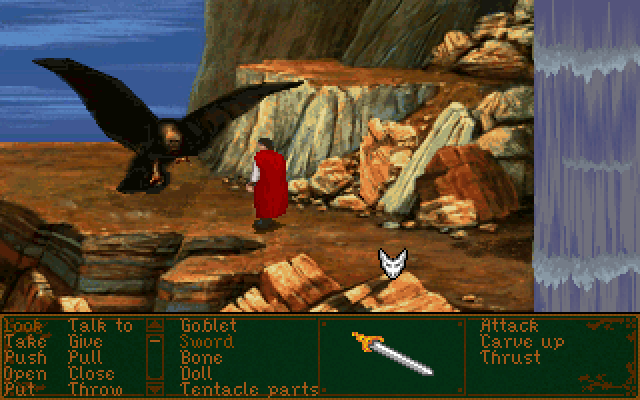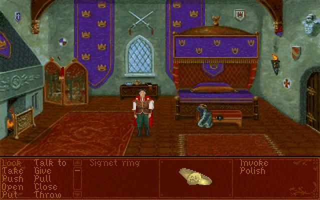 While the game is pretty standard point-and-click fare, unique features make this a lot more user-friendly than most games of the time. Most inventory items will have their own assigned verb, eliminating a lot of guesswork. For example, you start the game with a signet ring, that when invoked brings you back to the castle grounds. The verb “invoke” is listed next to the ring; while this could be considered dumbing down the game, there is still need for using standard action verbs (such as “put,” “give,” and “throw”) throughout. I will say I do miss the ability to drag and drop items onto one another to combine them, though there’s only a few puzzles that involved combining items and it’s all rather simple anyhow.