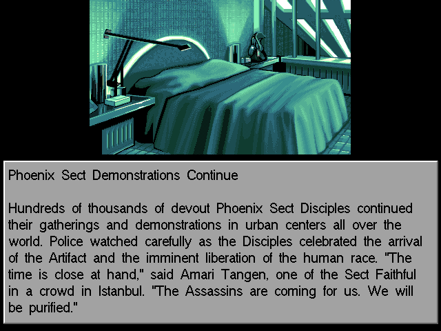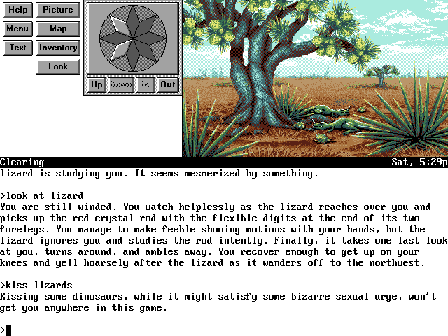 The graphics engine is identical to its predecessor. Each scene has a hand-drawn still graphic that helps capture the environment. Conversations happen on another screen with a better detailed image of who you’re talking to. And there are several animated cut-scenes that are low-res but still pretty. The music, on the other hand, is a disappointment, with repetitive digitized tracks that began to wear on me after a while.