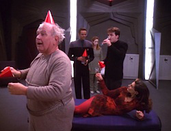 Review: A potentially fun but ultimately unsatisfying fluff episode about what would happen if luck was no longer random. Quark’s rival, the El-Aurian, is only mildly charming and never comes alive on screen. So it’s hard to care about anything he does or how he affects Quark.