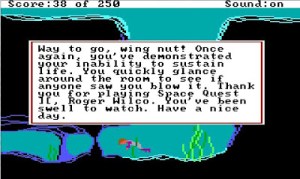 With that said, Space Quest does such a marvelous job of finding creative, unexpected ways for Roger to die that I simply had to discover them all. Lucky for me, I found a document on the web that detailed every death, so instant gratification was ever-ready. And with the ‘save’ and ‘restore’ functions one keystroke away, I never became frustrated.  However, I was lucky.  There are two distinct ways to put the game in an unwinnable situation.  One I experienced only made me have to restore back about ten minutes or so.  The other, which I avoided, requires one to start the game over.  It’s unlikely that you’ll encounter it if you’re thorough, but it’s still there.